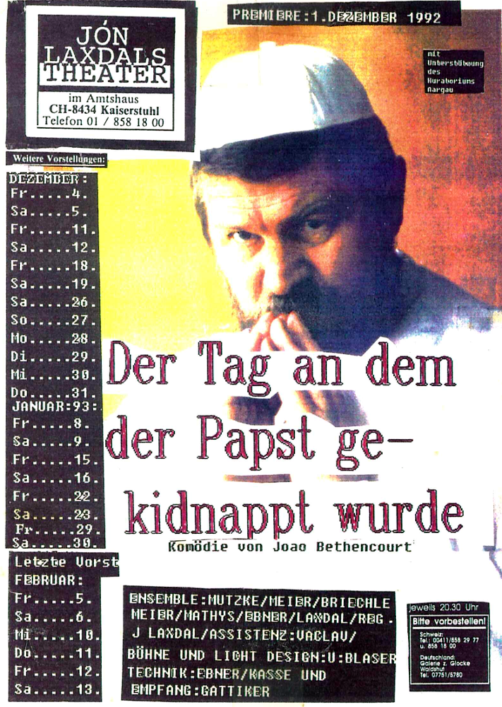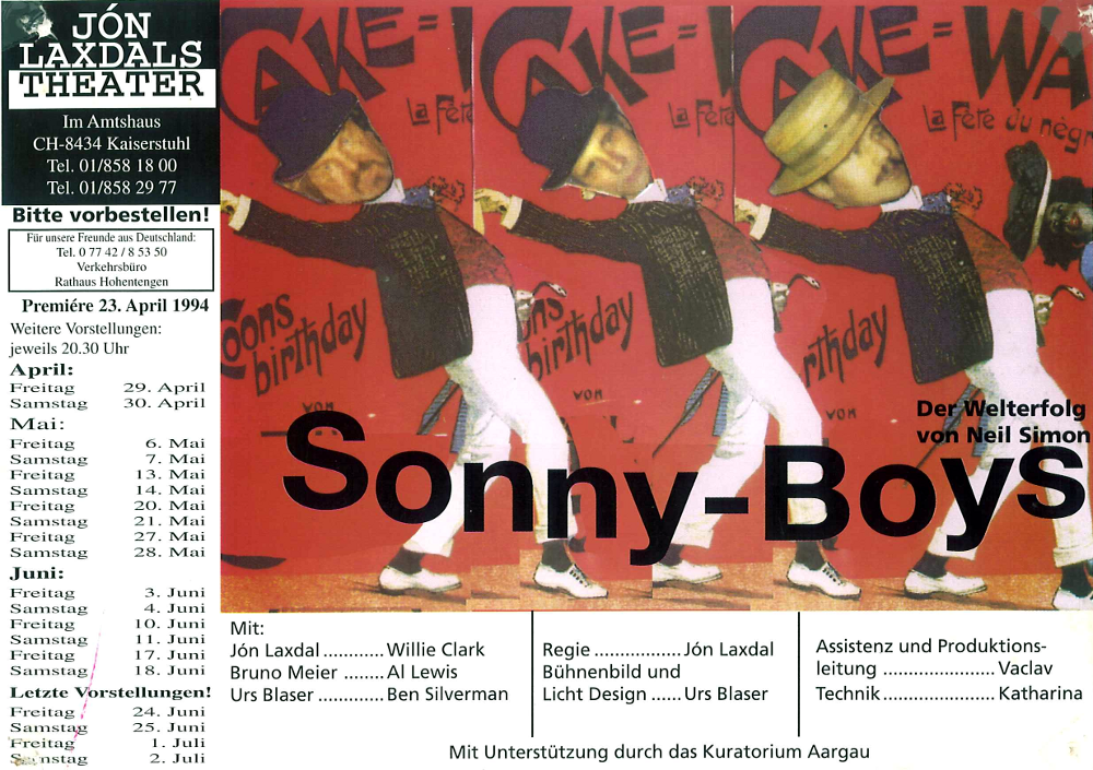 «Ein seltsames Paar», Neil Simon, 2004-2005, Flyer. «Die Panne», Friedrich Dürrenmatt, 2004, Flyer. «Bei Anruf Mord», Frederick Knott, 2003-2004, Flyer. «Altmodische Komödie», Alexei Arbusow, 2003, Flyer. «Mögliche Begegnung», Paul Barz, 2002-2003, Flyer. «Die Zimmerschlacht», Martin Walser, 2002, Flyer. «Duett für eine Stimme», Tom Kempinski, 2002, Flyer. «Liebesbriefe (Love Letters)», Albert R. Gurney, 2001-2002, Flyer. «Geschlossene Gesellschaft», Jean Paul Sartre, 2001, Flyer. «Wilhelm Busch und Blues», Geschichten und Musik, 2001, Flyer. «Ein Inspektor kommt», John B. Priestley, 2001, Flyer. «Beschimpfung der verheirateten Leute», nach Jaroslav Hašek, 2001, Flyer. «Lulus Roman», David Decca, 2000-2001, Flyer. «Ingeborg», Curt Goetz, 2000, Flyer. «Schule der Frauen», Molière, 1999-2000, Flyer. «Warten auf Godot», Samuel Beckett, 1999, Flyer. «Doppelfehler», Barry Creyton, 1999, Flyer. «Casanova auf Schloss Dux», Karl Gassauer, 1998, Flyer. «In welche Richtung schaut die Mona Lisa?», Herbert Rosendorfer, 1998, Flyer. «Seifenblasen», Curt Goetz, 1997, Flyer. «S’Elektrisch Herz», Karl Wittlinger, 1996-1997, Flyer. «Wer hat Angst vor Virginia Woolf?», Edward Albee, 1996, Flyer. «Der eingebildete Kranke», Molière, 1995, Flyer. «Die Gefoppten», nach «Der Revisor» von Nikolai Gogol, 1995, Flyer. «Falstaff und die lustigen Weiber von Windsor», nach William Shakespeare, 1995, Flyer. «Der Meteor», Friedrich Dürrenmatt, 1994-1995, Flyer. «Rumpelstilz», Adolf Muschg, 1994, Flyer. «Sonny Boys», Neil Simon, 1994, Flyer. «Play Strindberg», Friedrich Dürrenmatt, 1993, Flyer. «Mordübung», Jiri Polak, 1993, Flyer. «Der Tag, an dem der Papst gekidnappt wurde», João Bethencourt, 1992-1993, Flyer. «Bildung für Rita (Eudcating Rita)», William Russel, 1992, Flyer. «Hochzeitsreise (Private Lives)», Noël Coward, 1991, Flyer. «Das Himmelbett», Jan de Hartog, 1991, Flyer. «Adam, Eva und die Dampfwalze», André Kaminski, 1991, Flyer. «Bildung für Rita (Eudcating Rita)», William Russel, 1990, Flyer. «Wer hat Angst vor Virginia Woolf?», Edward Albee, 1989, Flyer. «Metamorphosen», nach Franz Kafka und Georg Büchner, 1989, Flyer. «De Hotzeblitz (Der Teufelsblitz)», Karl Wittlinger, 1989, Flyer. «Das Hochzeitsfest», Anton Tschechow, 1988, Flyer. «Pfarrhauskomödie», Heinrich Lautensack, 1988, Flyer. «Der Tod in Genf», nach «Das Attentat», Maria Matray und Answald Krüger, 1988, Flyer. «Der helle Wahn», Herbert Rosendorfer, 1987, Flyer. «Nächtliches Gespräch mit einem verachteten Menschen» und «Abendstunde im Spätherbst», Friedrich Dürrenmatt, 1987, Flyer. «Ich bin begeistert», Noël Coward, 1986, Flyer. «Pantersprünge» und «Valentiniaden», Karl Valentin und Kurt Tucholsky (Peter Panter), 1986, Flyer.